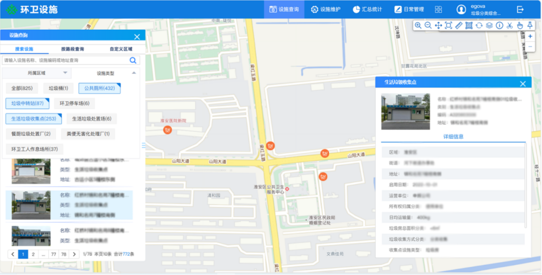 即刻了解實地調(diào)查淮安市200平方公里城區(qū)內(nèi)垃圾中轉(zhuǎn)站、餐廚垃圾處置場、生活垃圾收集點、環(huán)衛(wèi)停車場、公共廁所等11類城市環(huán)衛(wèi)設(shè)施,了解其運行的基本能力和運行狀態(tài),拍攝照片、視頻、全景等素材再現(xiàn)實況,構(gòu)建環(huán)衛(wèi)設(shè)施數(shù)據(jù)庫,為環(huán)衛(wèi)日常管理提供基本數(shù)據(jù)支撐。