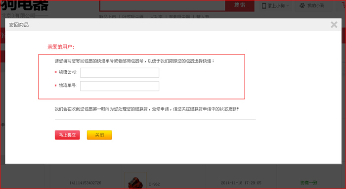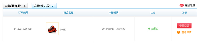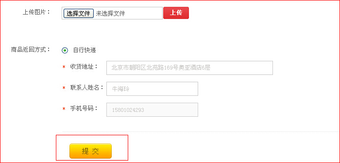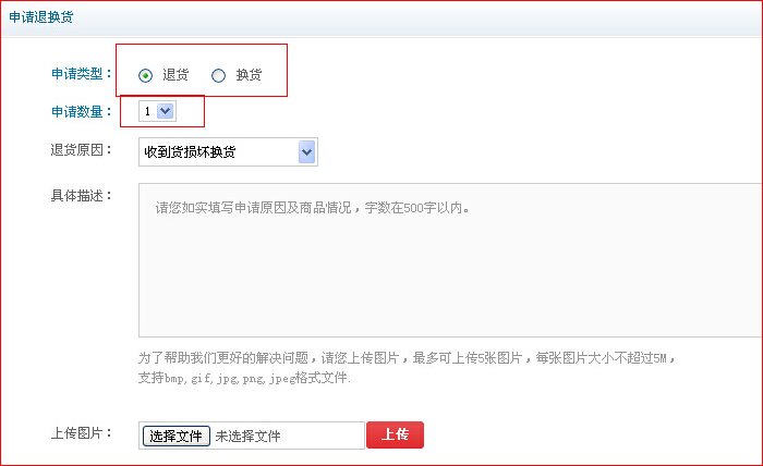 第三步:選擇”退貨“或者”換貨“,然后按要求填寫退換貨內(nèi)容,填寫完畢后點”提交“按鈕。 (備注:提交完畢后,”審核中“狀態(tài),用戶可以對提交信息進(jìn)行取消、修改)