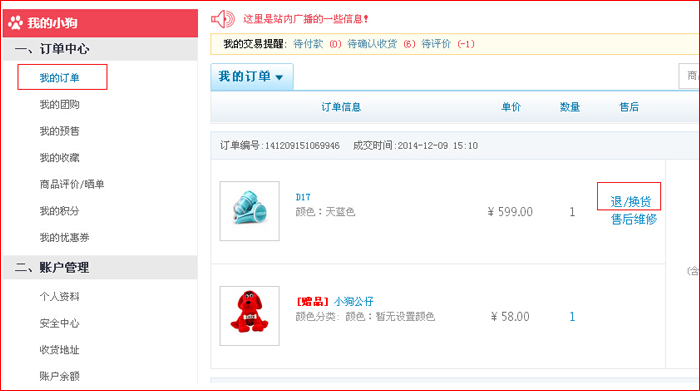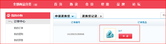 第二步:點擊“我的訂單“退換貨直接進(jìn)入退換貨頁面,或客戶服務(wù)下”退換貨“,點擊申請。